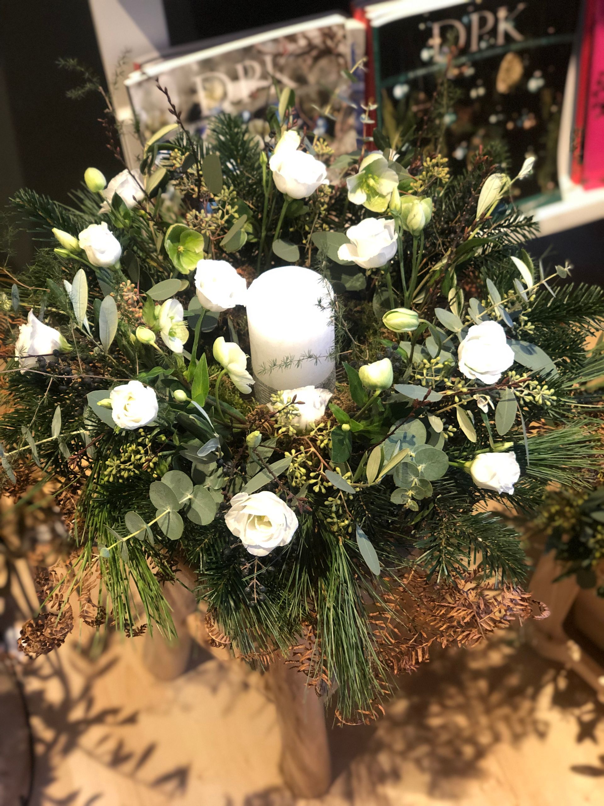 3. Een krans van steekschuim met daarin ook verse bloemen verwerkt, o.a. Amaryllissen, voorzien van allerlei soorten kerstgroen, met of zonder kerstballetjes, naar eigen inzicht te versieren. Deze krans kun je op een schaal leggen en eventueel voorzien van een windlicht met kaars in het midden.